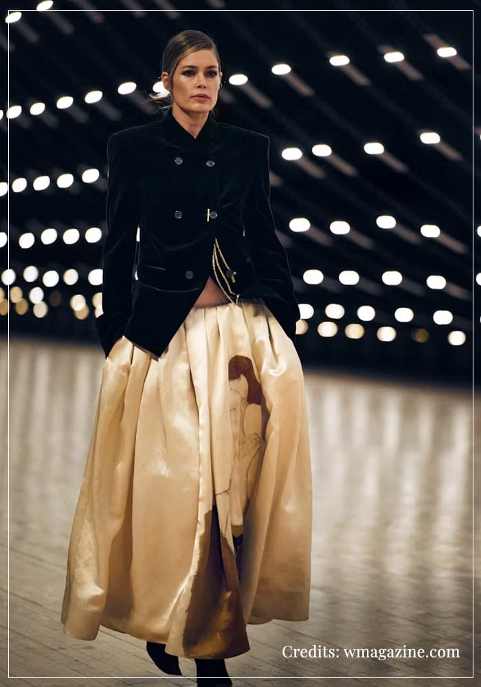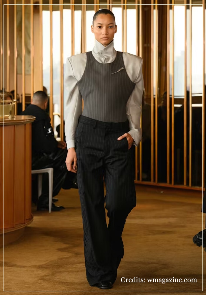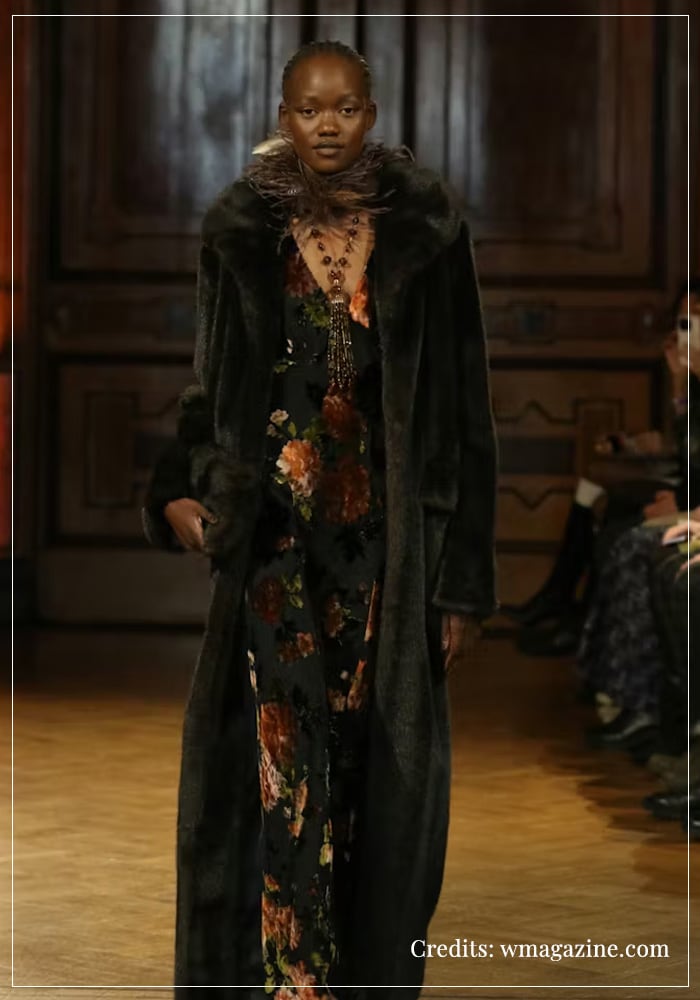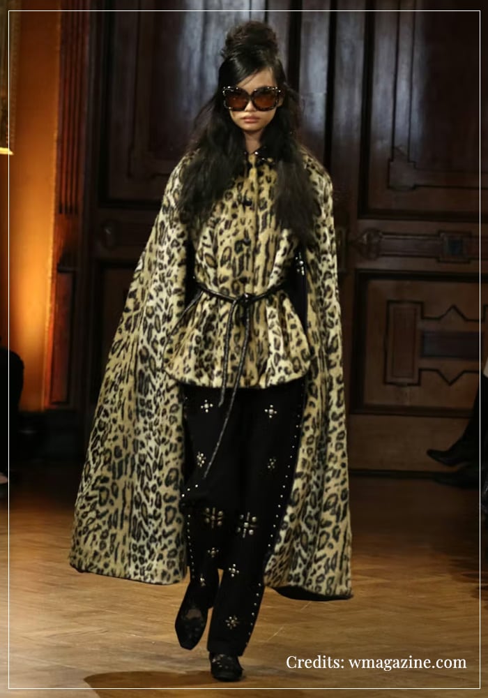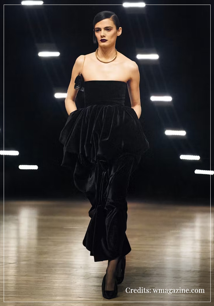 Collina Strada turned the runway into a celebration of individuality with layered mesh, metallic florals, and playful prints. The energy felt spontaneous and joyfully rebellious. A chiffon flowy dress styled with chunky sneakers became an instant viral moment.