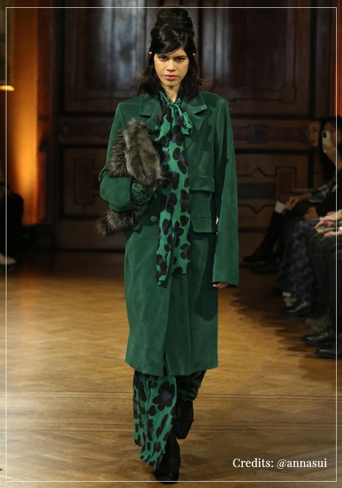 Anna Sui revisited 1980s London’s New Romantic spirit, drawing from the legendary Blitz Club. The runway felt like a decadent costume party layered with rebellion and romance. Velvet, feathers, and jewel tones created a theatrical, rule-breaking fantasy.