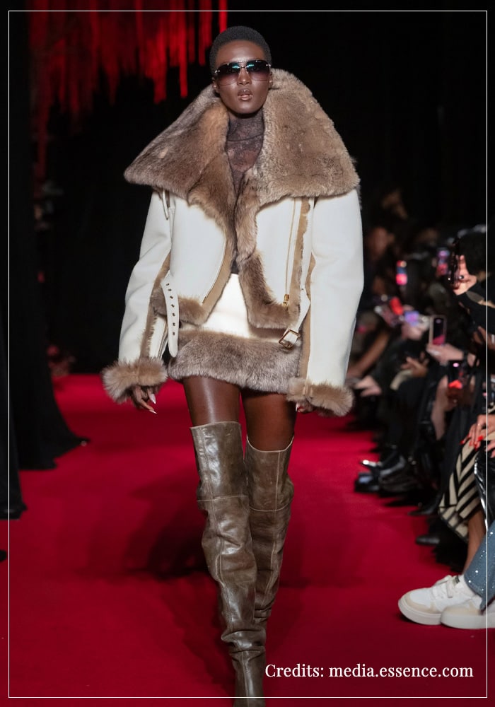 Coach leaned into cozy-cool with oversized shearling and playful collegiate graphics. Elle Fanning walked with effortless charm, while Storm Reid added star power from the front row. A fuzzy colorblock jacket captured winter survival with style intact.