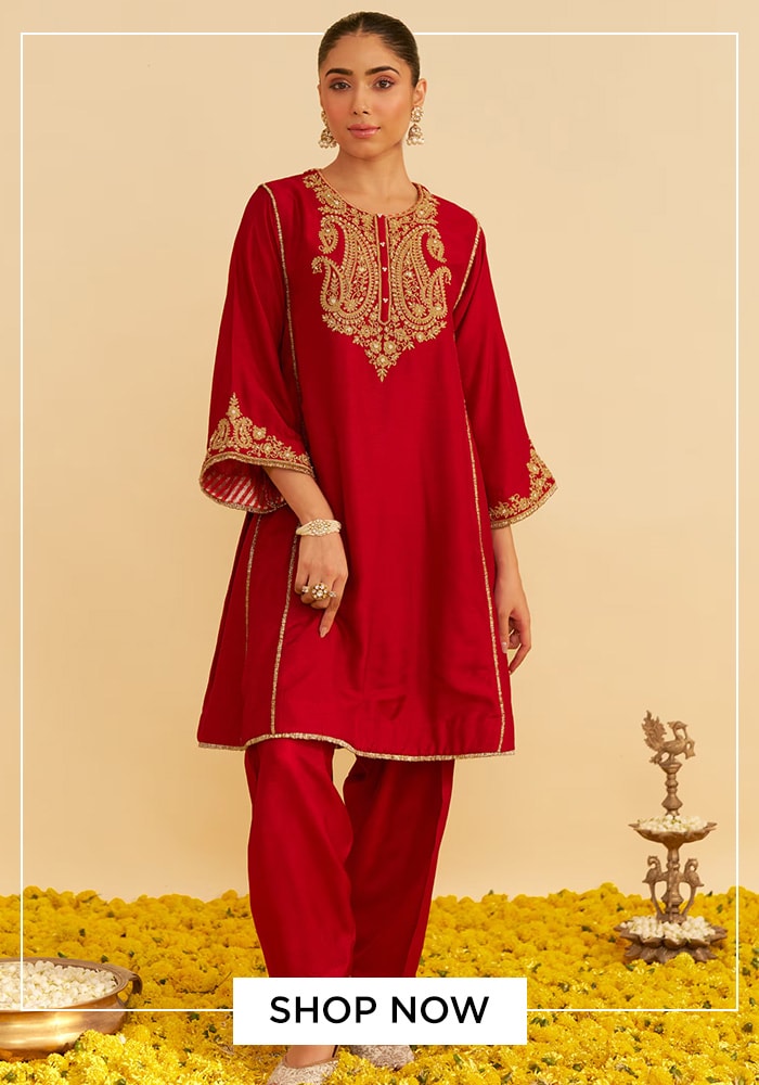 Embrace the auspicious color of red with this stunning kurta set. The vibrant red hue is perfect for festive occasions, symbolizing energy and purity. The Ayra Kurta features intricate embroidery around its round neck, adding a touch of traditional craftsmanship to a modern silhouette. Paired with a comfortable salwar, this outfit offers both elegance and ease of movement, making it ideal for a day filled with puja and family time. This is one of the most classic Ram Navami ethnic looks you can choose.