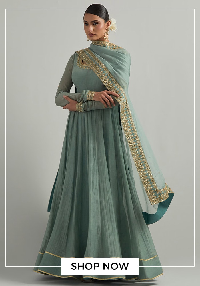 Anarkali sets are beloved for their flattering and graceful silhouette. This beautiful set in a cadet blue hue combines Chanderi and organza for a light, airy feel. The square neckline is a unique design element, and the hand embroidery adds a layer of exquisite detail. This Anarkali suit is perfect for those who want a blend of comfort and grandeur, making it a fantastic choice for a full day of Ram Navami festivities.