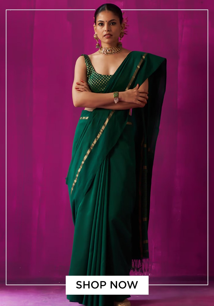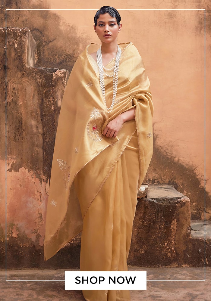 Nothing says festive like the color gold. This tissue saree from Geroo Jaipur is a vision of traditional elegance. The designer saree is embellished with classic Gota Patti work and embroidery, techniques that have been part of Indian celebrations for centuries. The round neck blouse completes the set, offering a cohesive and regal look. If you're wondering what to wear on Ram Navami for a truly traditional feel, this gold saree is an impeccable choice.