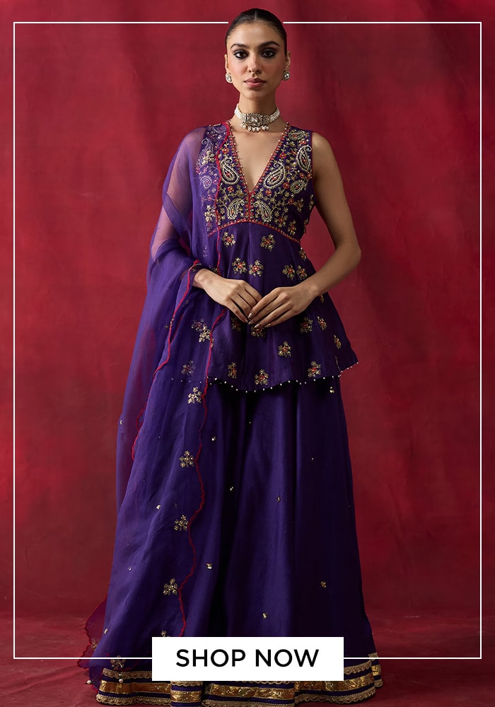 For a modern and trendy Ram Navami ethnic look, consider this purple peplum kurta and sharara set. The peplum silhouette is fashionable and flattering, while the sharara pants add a touch of drama and flair. Crafted from Chanderi and organza, the outfit is light and comfortable. The intricate embroidery adds a festive touch to the beautiful purple hue. This set is ideal for those looking to experiment with contemporary Indian wear while staying true to the festive spirit.