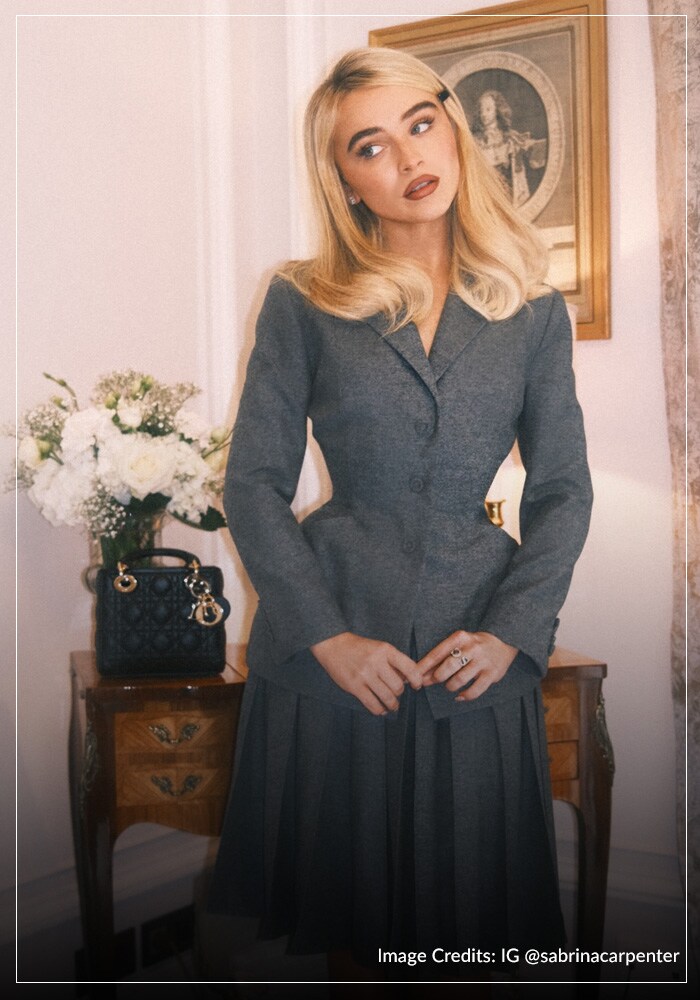 Sabrina Carpenter walked into Dior's show in a grey blazer and pleated skirt. The singer complemented the attire with an iconic black Lady Dior bag, creating a classy and stunning look.