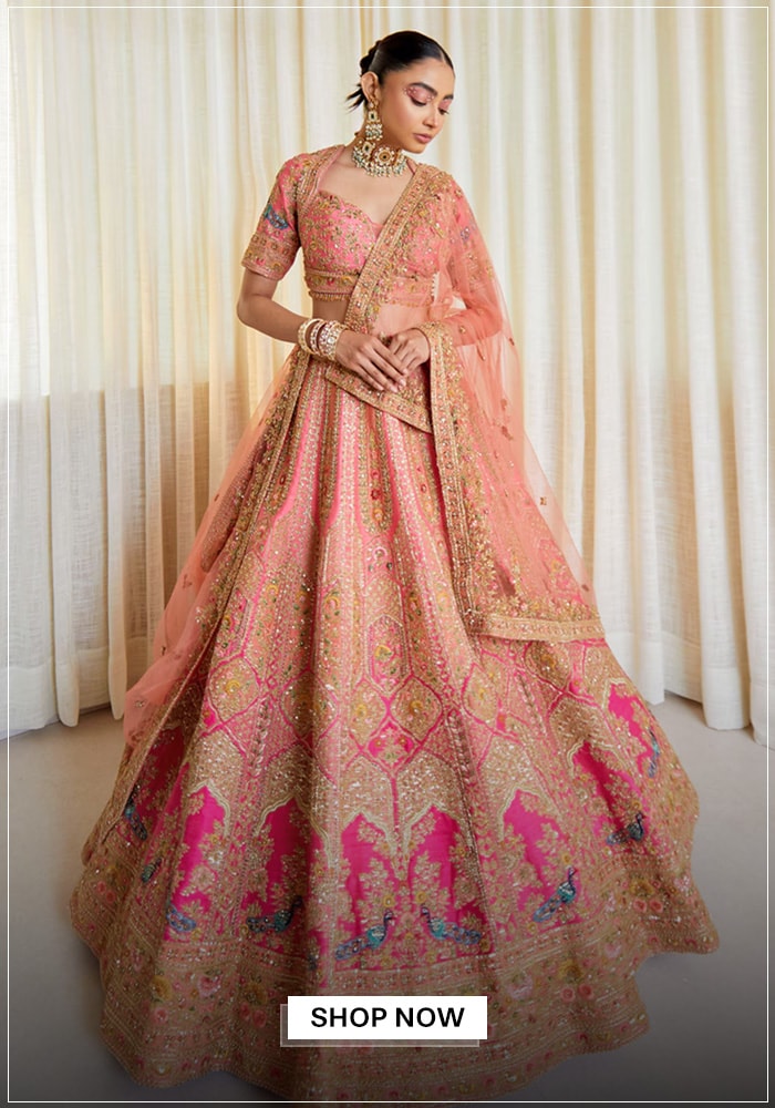 Exhibit your fierce passion for the colour of rose with designer pink lehengas at Aza Fashions. Rosy-hued lehengas are trending amongst Bollywood stars primarily because of their ultra-feminine appeal and for being the strongest contender to red lehengas.