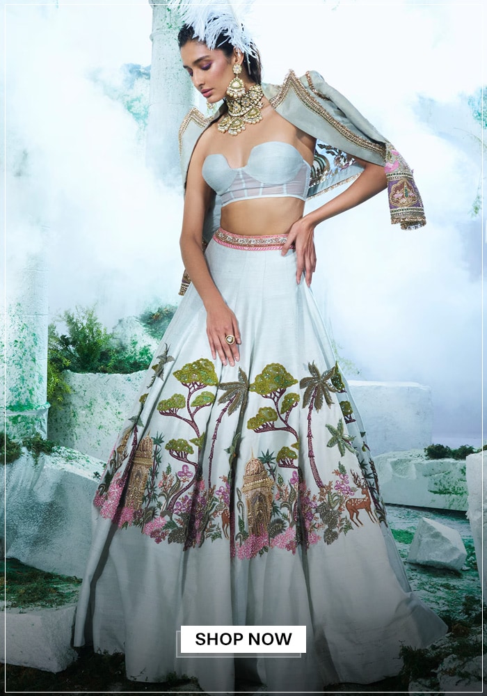 - Earn bonus style points by pairing your ivory lehengas with nudes, fuchsia pink, or deep brown shades.