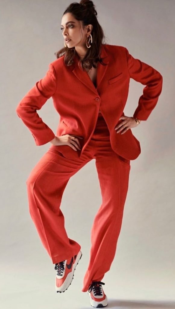 Style Breakdown - Deepika paired this red pant-suit with over-sized gold Outhouse hoops, minimal necklaces, Cartier band and Nike shoes.