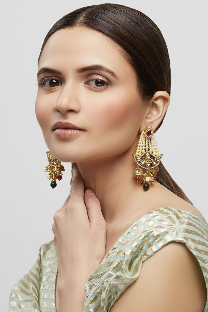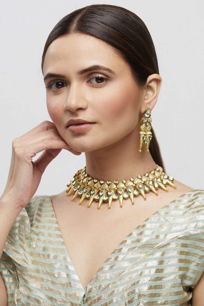 Want to add a hint of some iconic pearls to your look? Pick this classy choker set featuring three tiers of pearls and polki stones. Since the piece is equal parts elegant and traditional, we suggest you pair it with your saree to elevate the ethnic vibe.