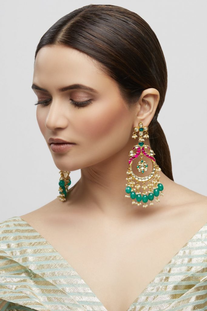 Statement earrings are every fuss-free woman's go-to. And if you've overused your jhumkis and the other staples, it's time to give polki chandeliers a fair chance. These shoulder-grazing beauties must be rightfully paired with your detailed lehenga or a sharara set for a regal look.