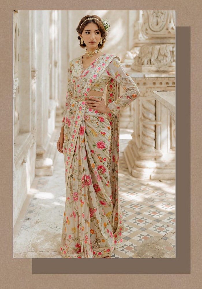 Mehendi calls for colors that pop and easy festivities. Like This Paulmi and Harsh Pre-Stitched Saree – a perfect blend of comfort, quirk and charm. Get ready to glam up the Mehendi festivities with this floral stunner!