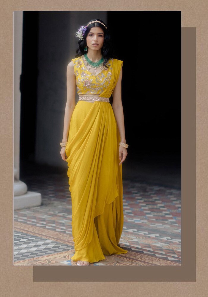 When it's time for Haldi, you need a saree that will make you shine brighter than the sun. This Paulmi and Harsh number in a delightful sunny hue is the ultimate yellow saree for Haldi. Get ready to glow, girl!