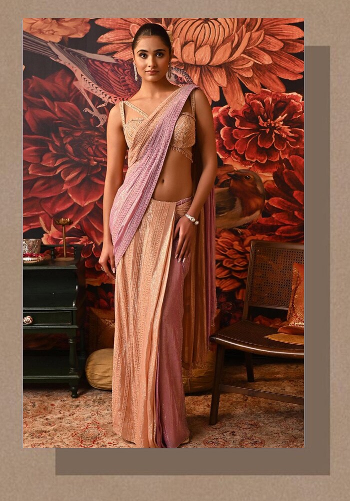 Cocktail parties are all about making a bold and fabulous statement. MOLEDRO’s Rumi Embroidered Pre-Draped Saree is your ultimate hype-man. It's like having your own personal stylist in the form of a saree
