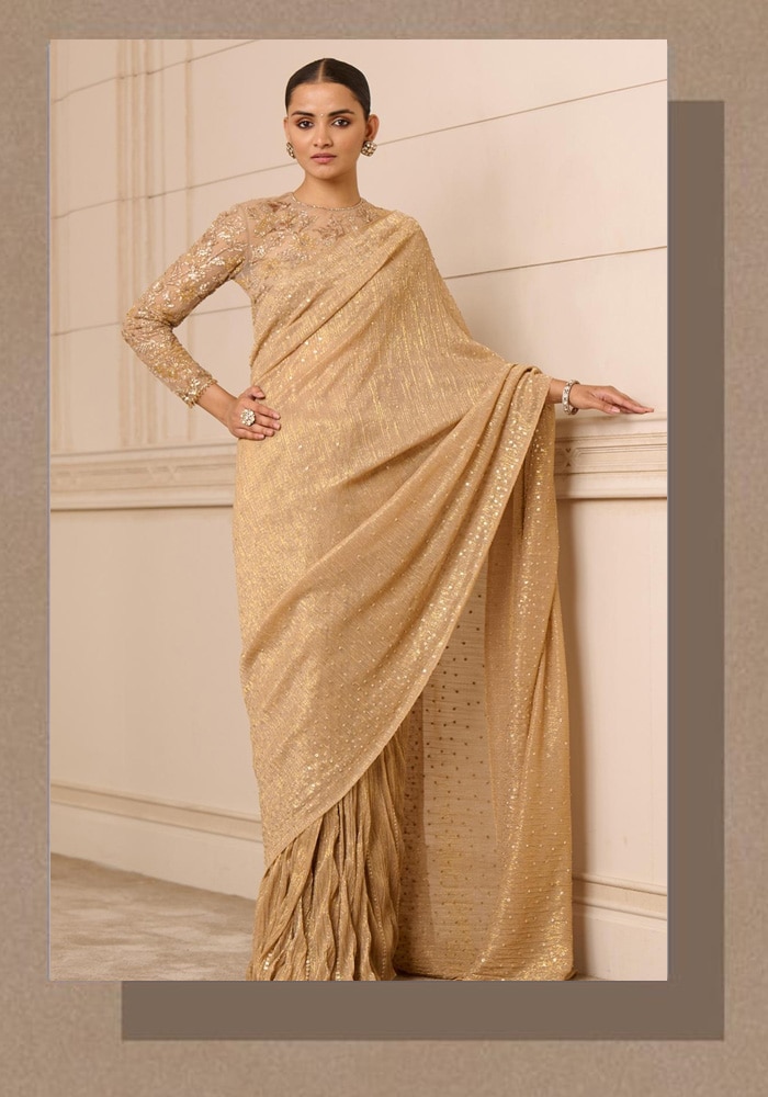 If being a fairytale bride is your idea of the perfect wedding outfit, this Tarun Tahiliani crinkle net embroidered saree is made just for that! It's like wearing a fairytale woven with intricate embroidery to make it come alive. Prepare to say "I do" to this beauty!