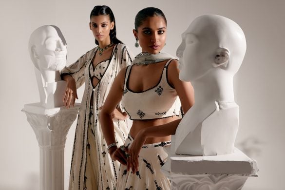 If you prefer to opt for a modern style, consider a jacket sharara set. This blue sharara with a crop top and jacket by designer Samyukta Singhania features geometric hand embroidery. Comfortable and chic, it is a refreshing look you must add to your closet.