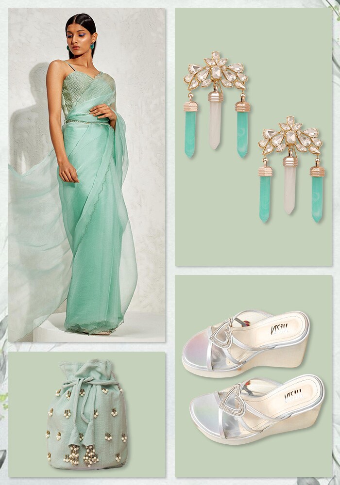 Steal the spotlight with an organza metallic green pre-draped saree for galas events or dinners with pals. Pick shimmering chandelier earrings like this Ae-Tees' in the picture above. Elevate your saree's look by standing high on inches with Tiesta's wedges and get yourself a potli to complete the look.