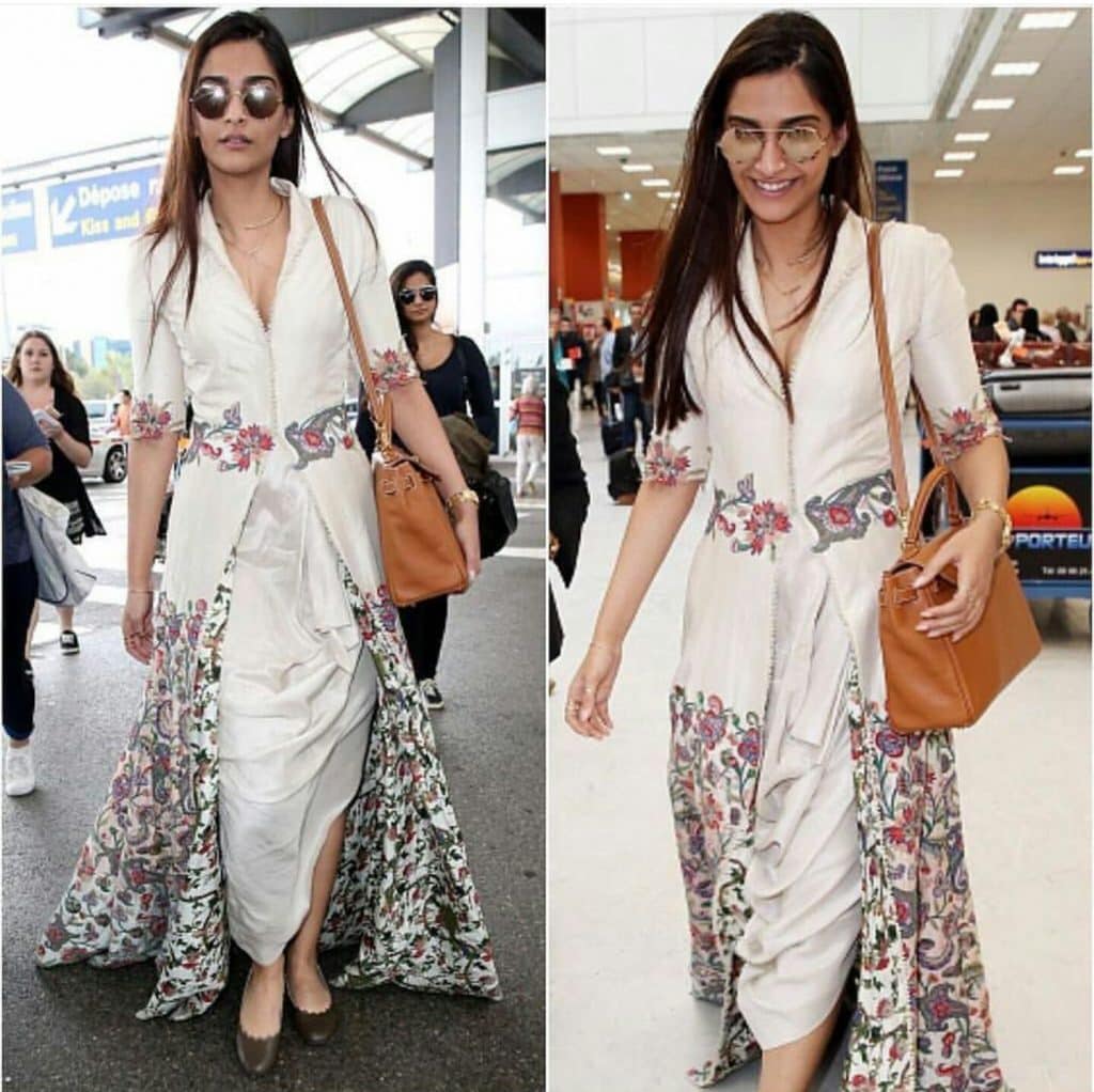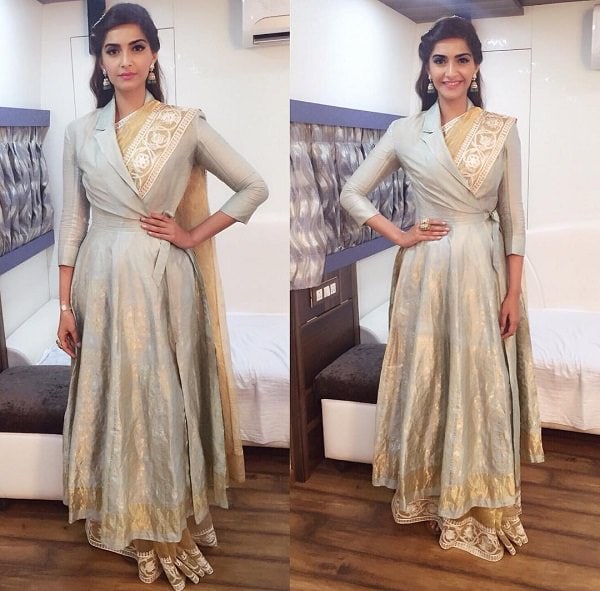 Sarees are another popular style that you will find Sonam wearing often. But being the fashion forward person that she is, her silhouette is often paired with jackets, belted details, drapes etc to keep it interesting and distinct.