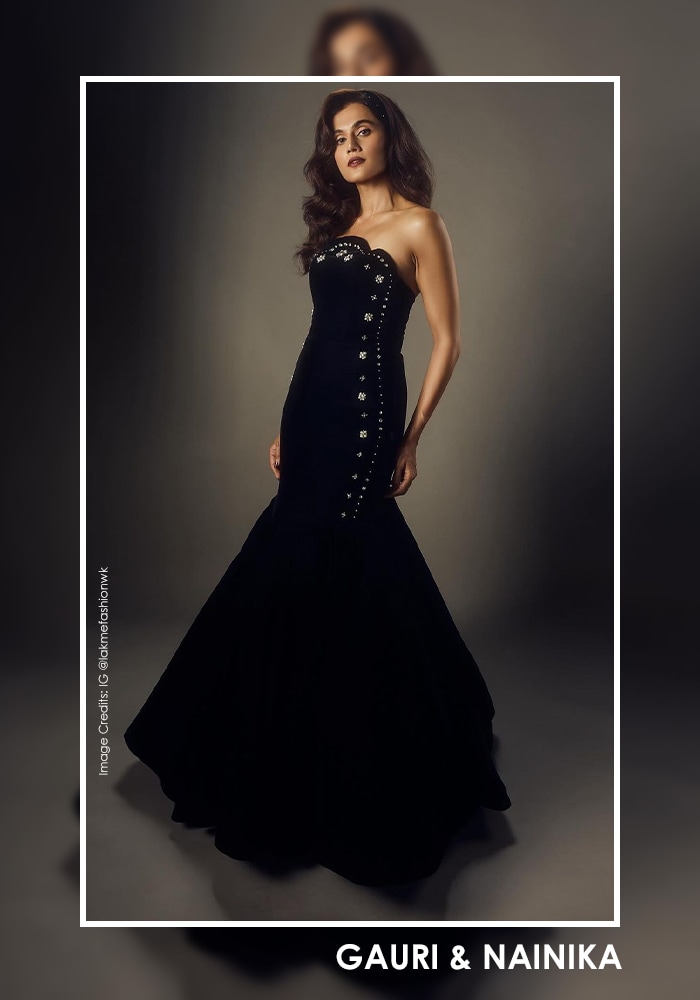 Taapsee Pannu stuns in Gauri & Nainika's diverse palette of floral prints and mermaid gowns, exuding elegance and grace.