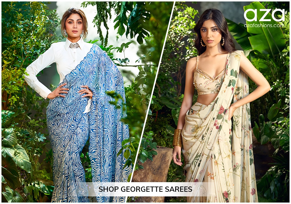 - Georgette Sarees: A lightweight georgette saree is an excellent choice for modern women who want to move around freely while looking effortless. Opt for bright colors like mustard yellow, emerald green, or vermillion red to mirror the harvest colors.