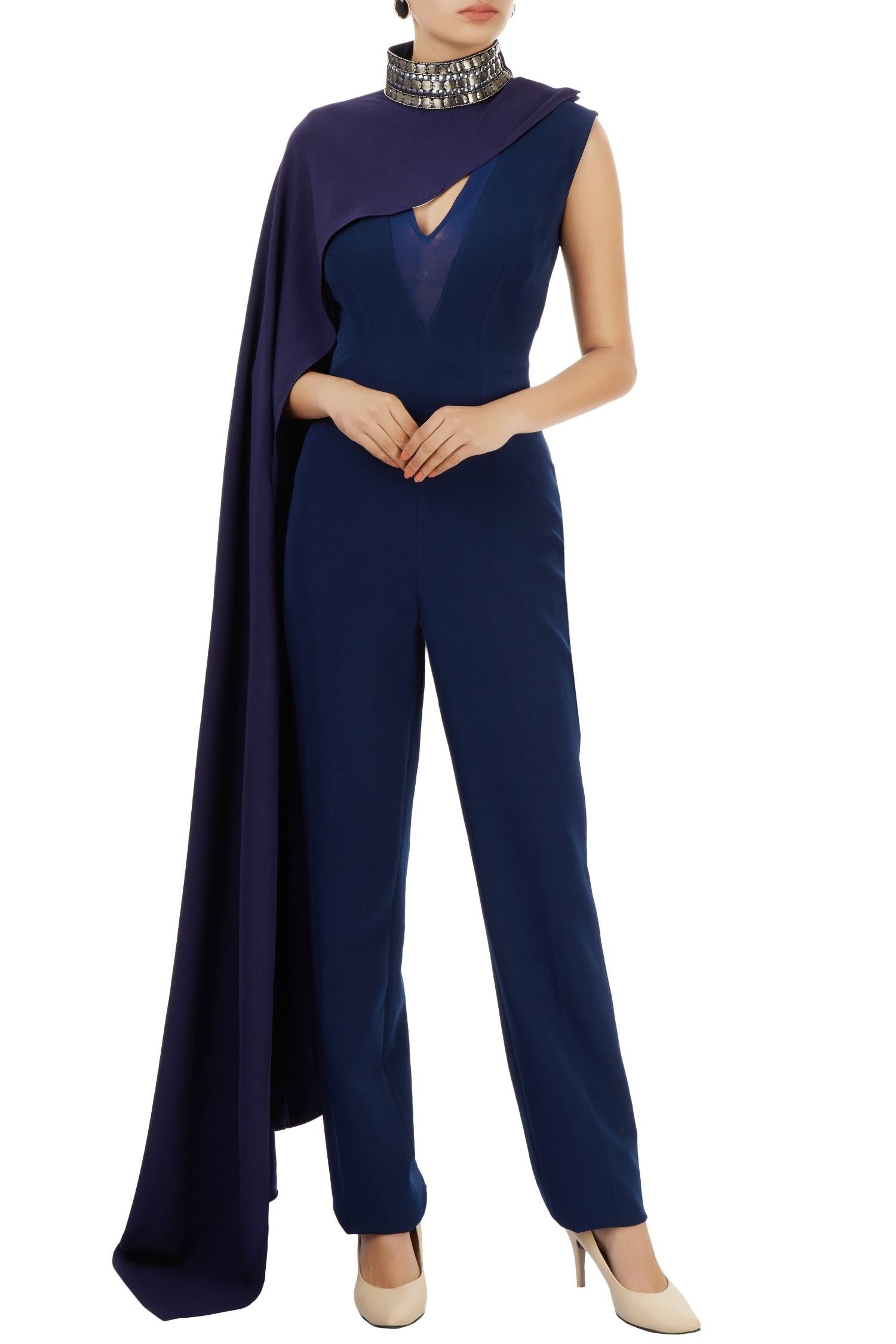 7# Go the unconventional style route and pick this cape style jumpsuit by Namrata Joshipura for an evening soiree. It is enhanced with white applique motifs all across the front bodice.