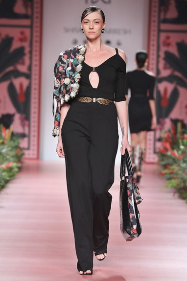 12# This Shivan and Naresh black jumpsuit with cold-shoulder details is for the Boss Lady in you. Pair it with a trendy jacket and you have a stunner.
