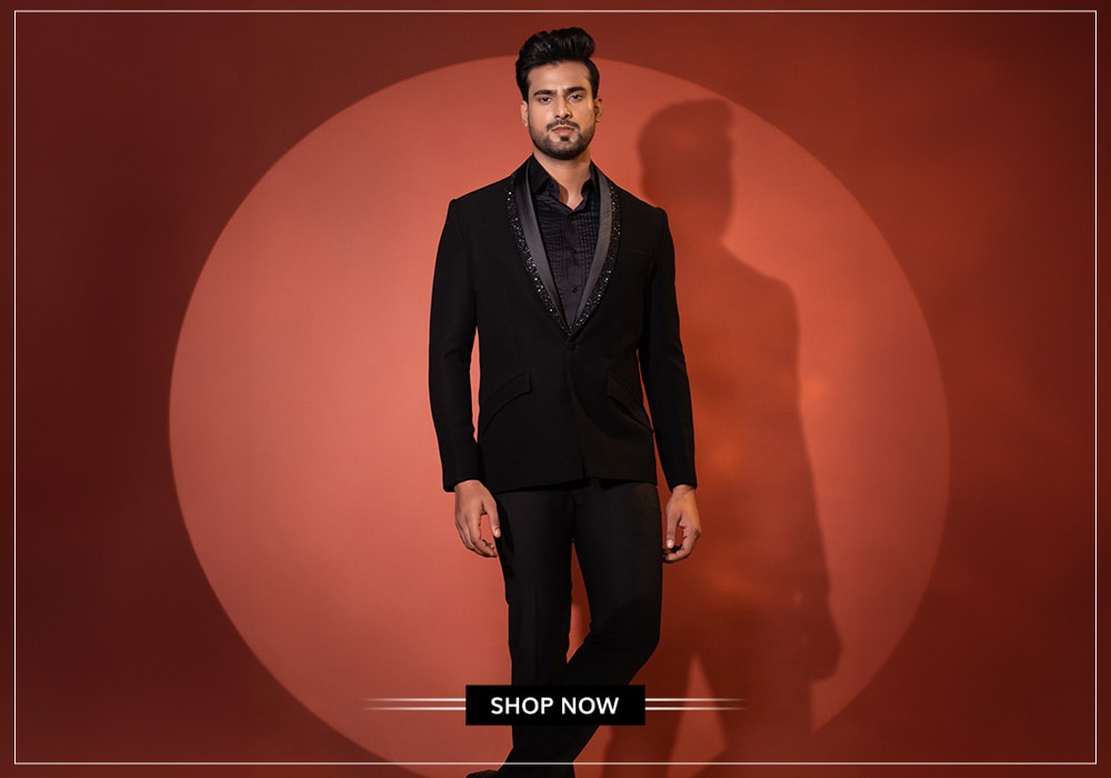 For a tuxedo, classic black or midnight blue is timeless. For a suit, navy, charcoal, and grey are safe and stylish choices. For a bolder statement at a sangeet or reception, you can explore jewel tones like emerald green, burgundy, or royal blue.