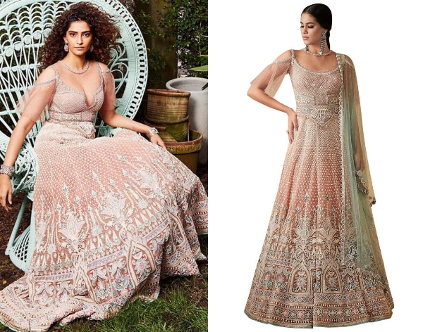 Sonam Kapoor was featured in Brides Today magazine wearing this salmon pink embroidered anarkali set featuring cold-shoulder sleeves. This gorgeous piece is meant for the bride's reception and now retails for Rs 1,75,000 after a splendid 50% off.