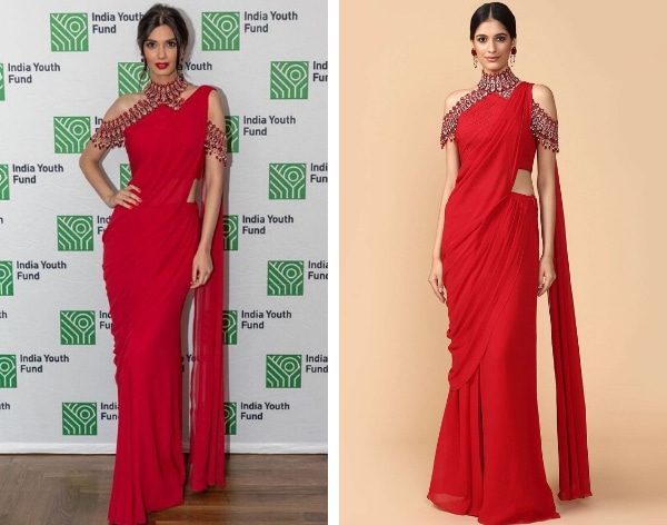 Wondering what to wear to an engagement? This red pre-draped saree as seen on Diana Penty checks all the boxes for a stunning guest wardrobe. At Rs 63,900, it is worth every pretty penny.
