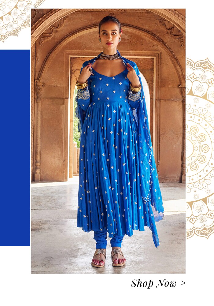 Seema Nanda’s blue embroidered anarkali set is a celebration, bursting with ethnic charm, colour, and flow. Dotted with floral dori designs, the ethnic masterpiece is perfect for twirling and dancing.