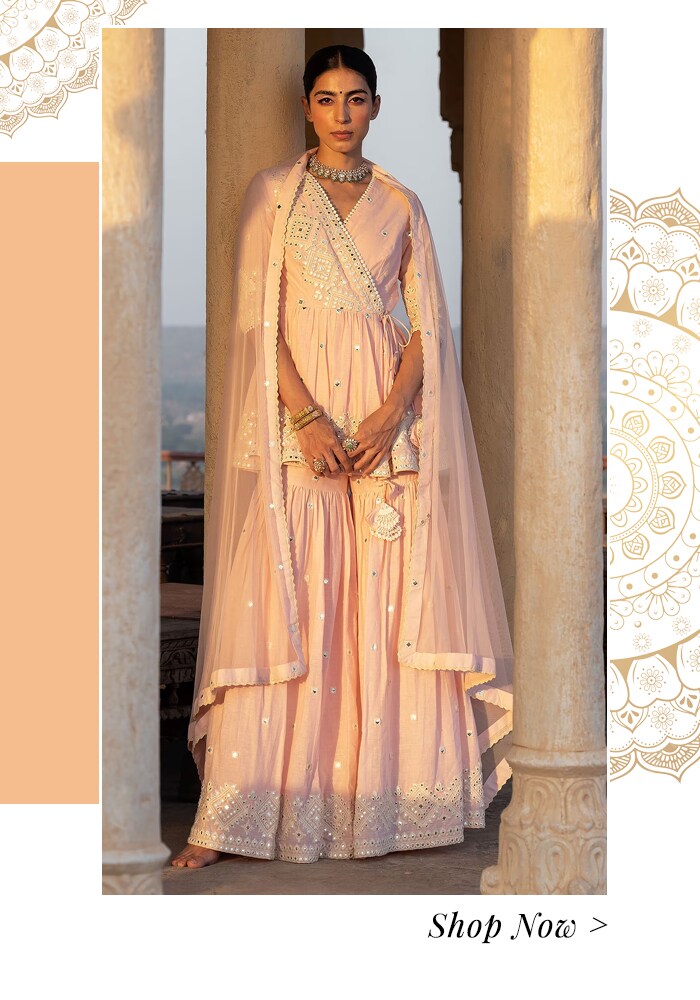 Grace meets glamour in motion in this blush-pink Indo-Western Teej outfit. An epitome of delicate sophistication, the sharara pant paired with an embellished angarkha top in soft cotton creates an effortlessly statuesque look. The net dupatta adds movement, whereas the structured silhouette brings in a bold and contemporary edge.
