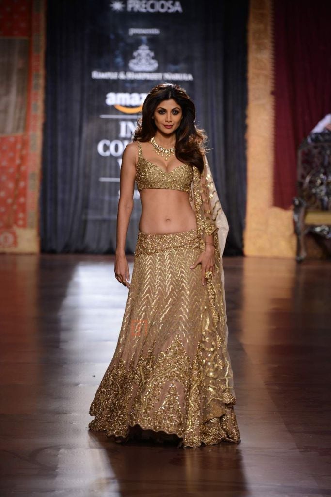 Shine bright like a diamond at your reception in a high-impact, gold lehenga that highlights your figure. We recommend pairing the heavy lehenga-choli with a sheer dupatta that adds femininity and grace, and styling the look with big glamorous hair.