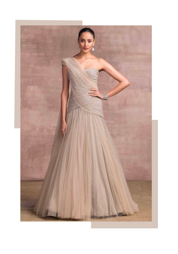Infusing statement accessories with your simple gown is always a safe bet to play when attending soirees or functions like cocktails or receptions. If you are selecting a designer gown for your own wedding events, you must look for options like an embroidered gown, draped gown, embellished gown, one-shoulder gown, and more.