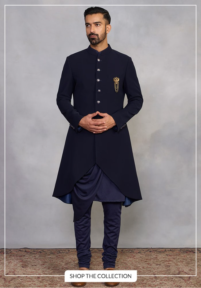 An Achkan is similar to a sherwani but is usually lighter and shorter. It is perfect for engagement ceremonies where you want to look traditional but not "overdressed."