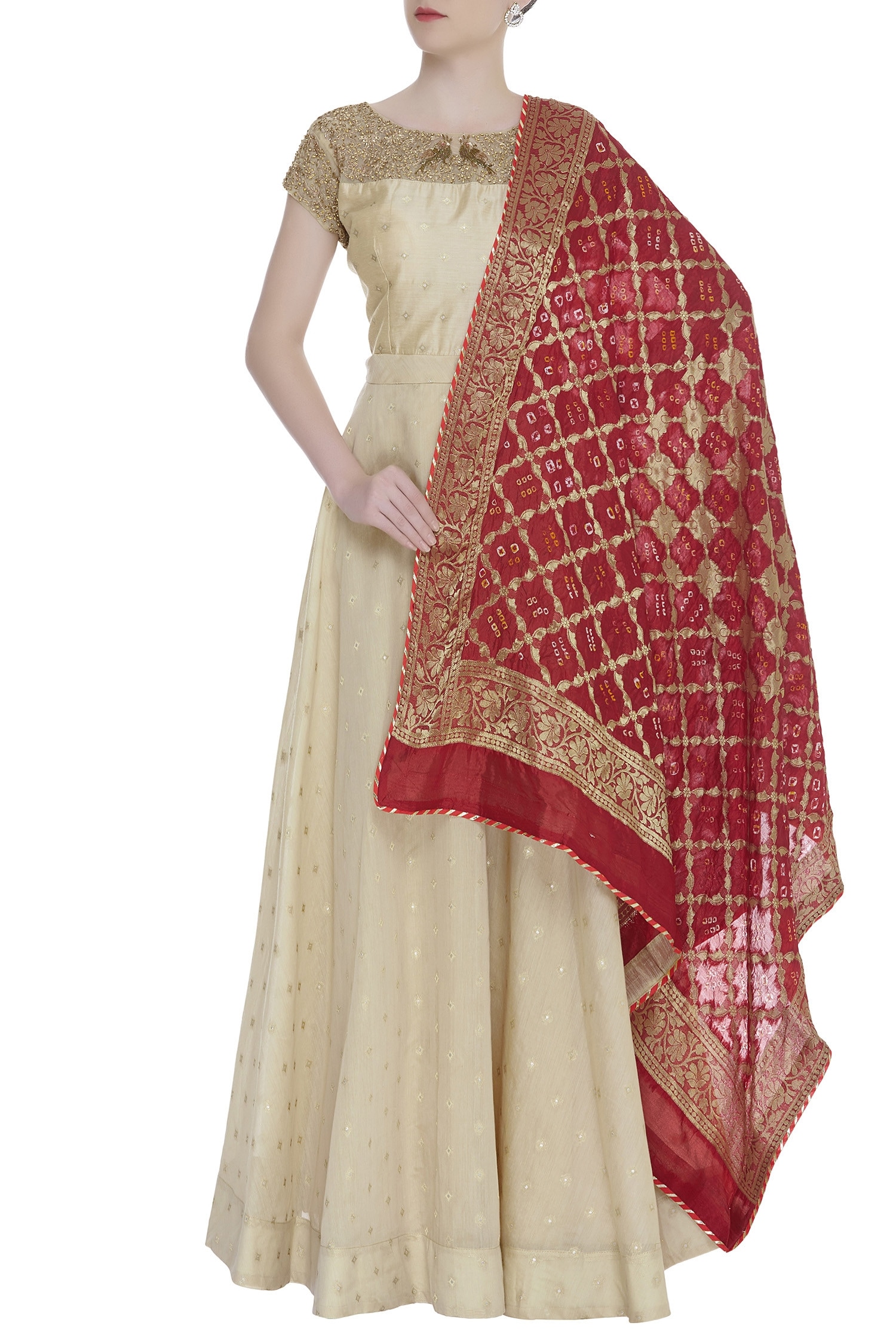 Not a fan of heavily embroidered or printed - fear not! we have just the right element to add to your ensemble to keep it light but rightly rooted. This bandhani print dupatta and anarkali combo by Nazaakat is the epitome of sheer elegance. Get this Look Here