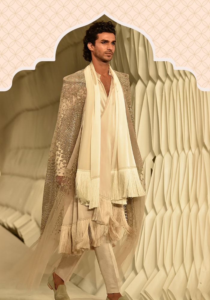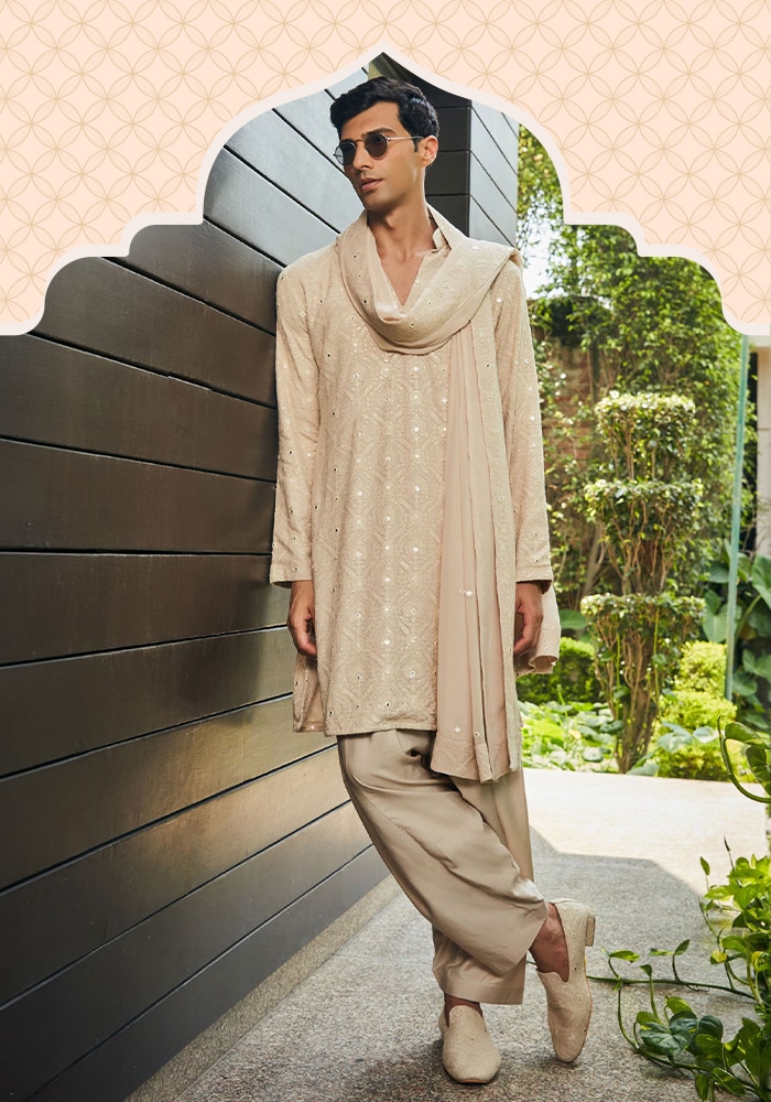 Candy-colored kurta sets can instantly roll out sunshine of the springtime and warmth, no matter the season. Take a peach cotton embroidery kurta set from Darshika Menswear or an ivory linen kurta joggers set adorned by Bollywood star Zaheer Iqbal as inspirations to make your festive dressing stand out amidst loud Indian ensembles.
