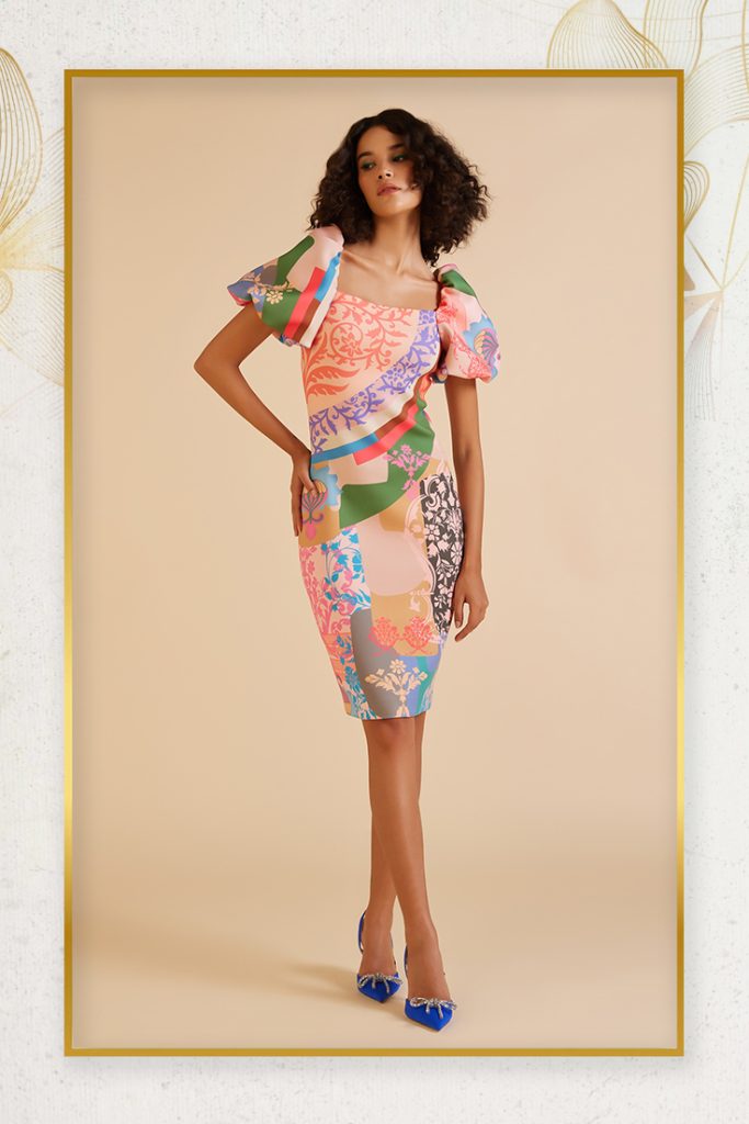 For Her, a printed dress with puffed sleeves by Pankaj & Nidhi with a tote bag would be a great pick.