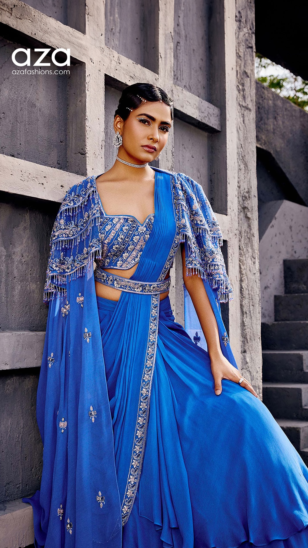 Bring in the visuals of luxury and vintage in one outfit on your cocktail bash with this hand-embroidered blue piece paired with a corset blouse.