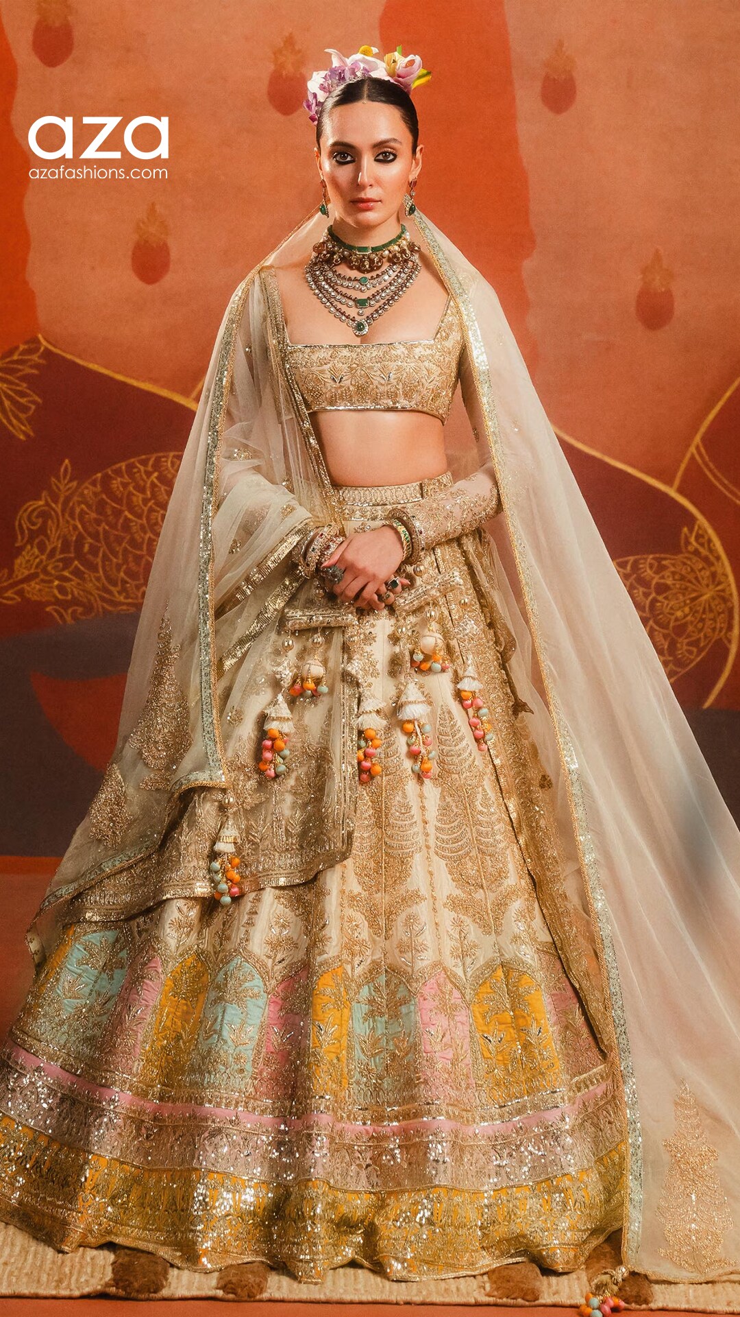For a spectacular appearance, opt for the Motichur Lehenga displaying ornate embroidery.