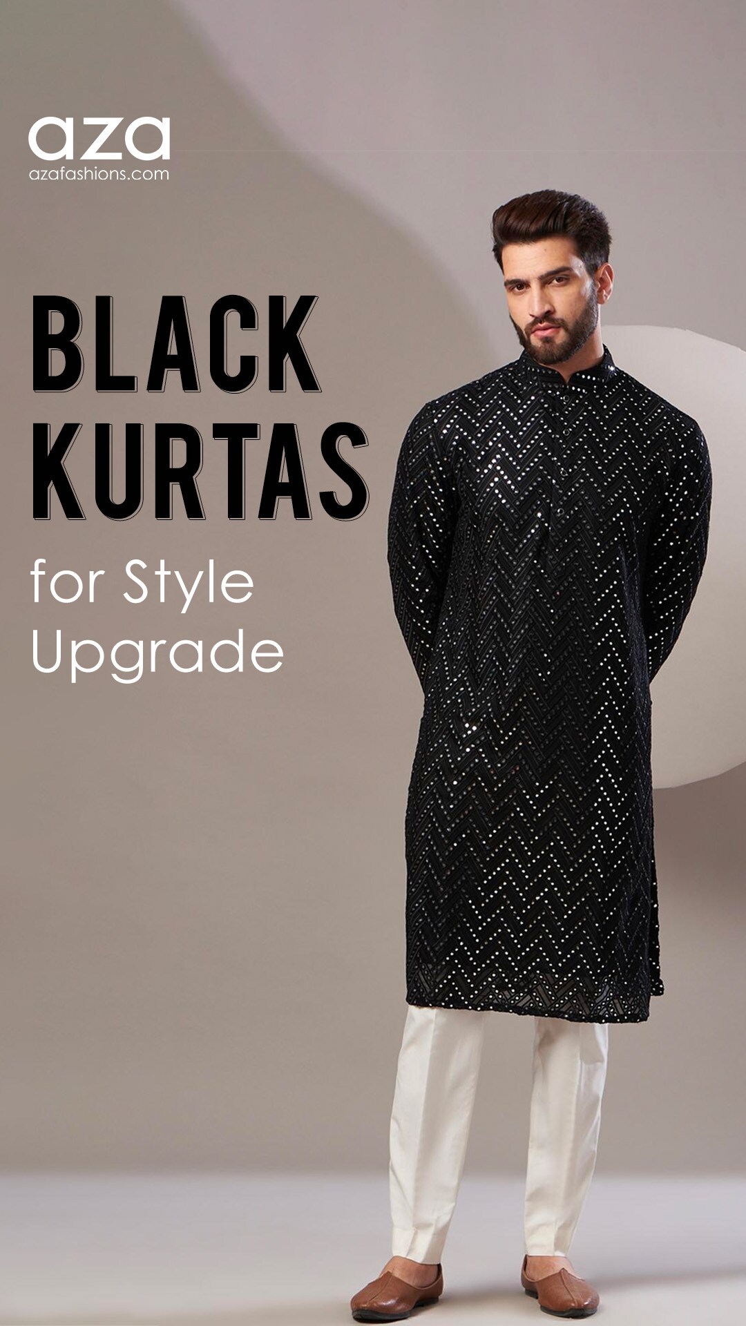 Mandarin collar black kurta with detailed yoke style for a classic appeal.