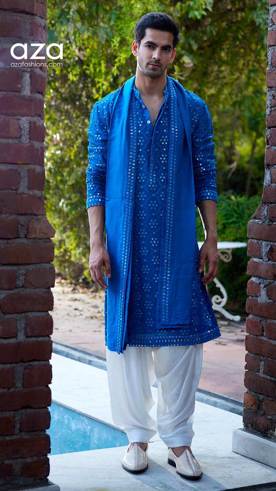 Add this embroidered Lucknowi shirt set to your closet for sangeet rituals.