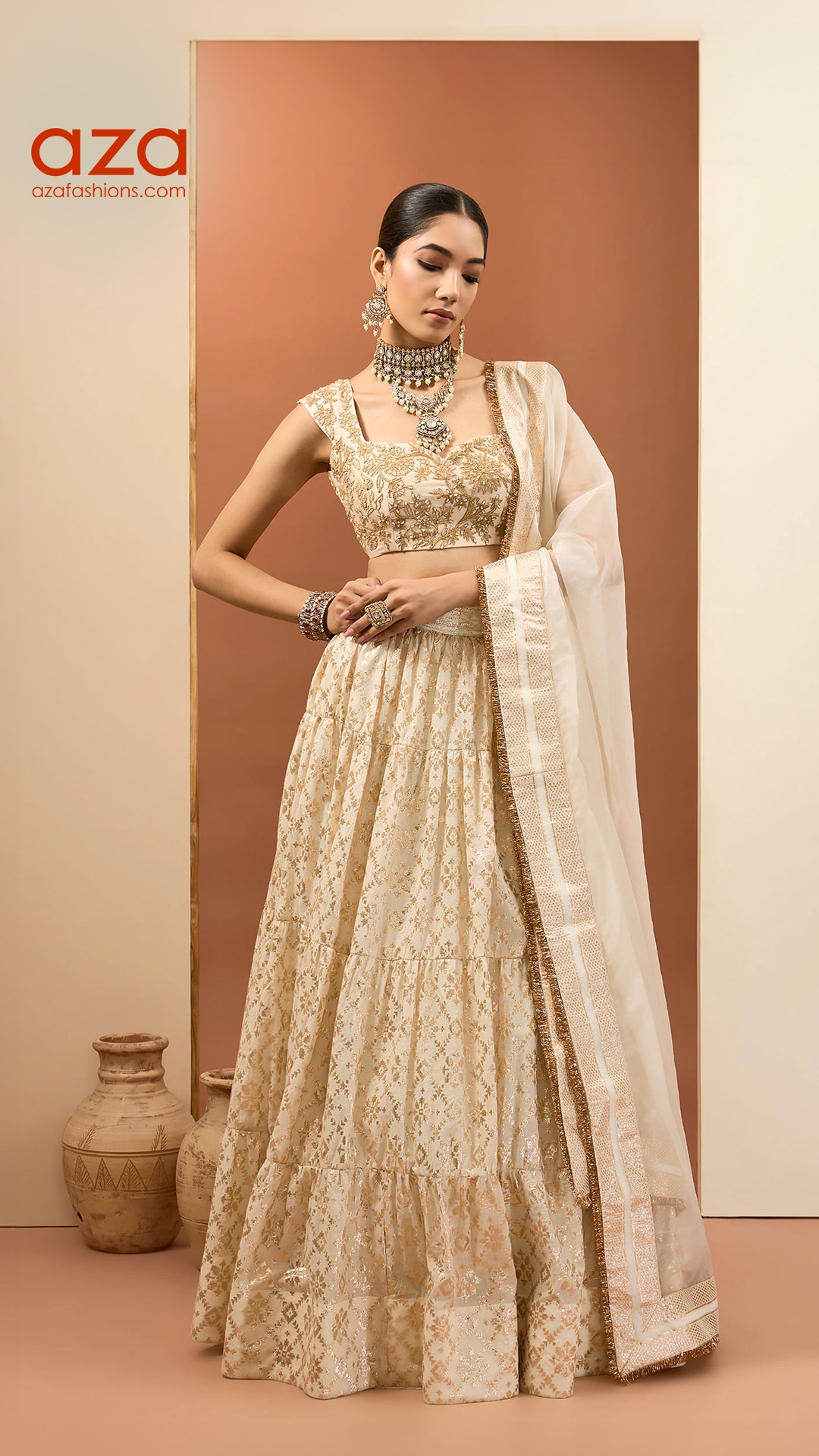 A chic look for the reception, this peach tiered lehenga features an embroidered cape that enhances the attire.