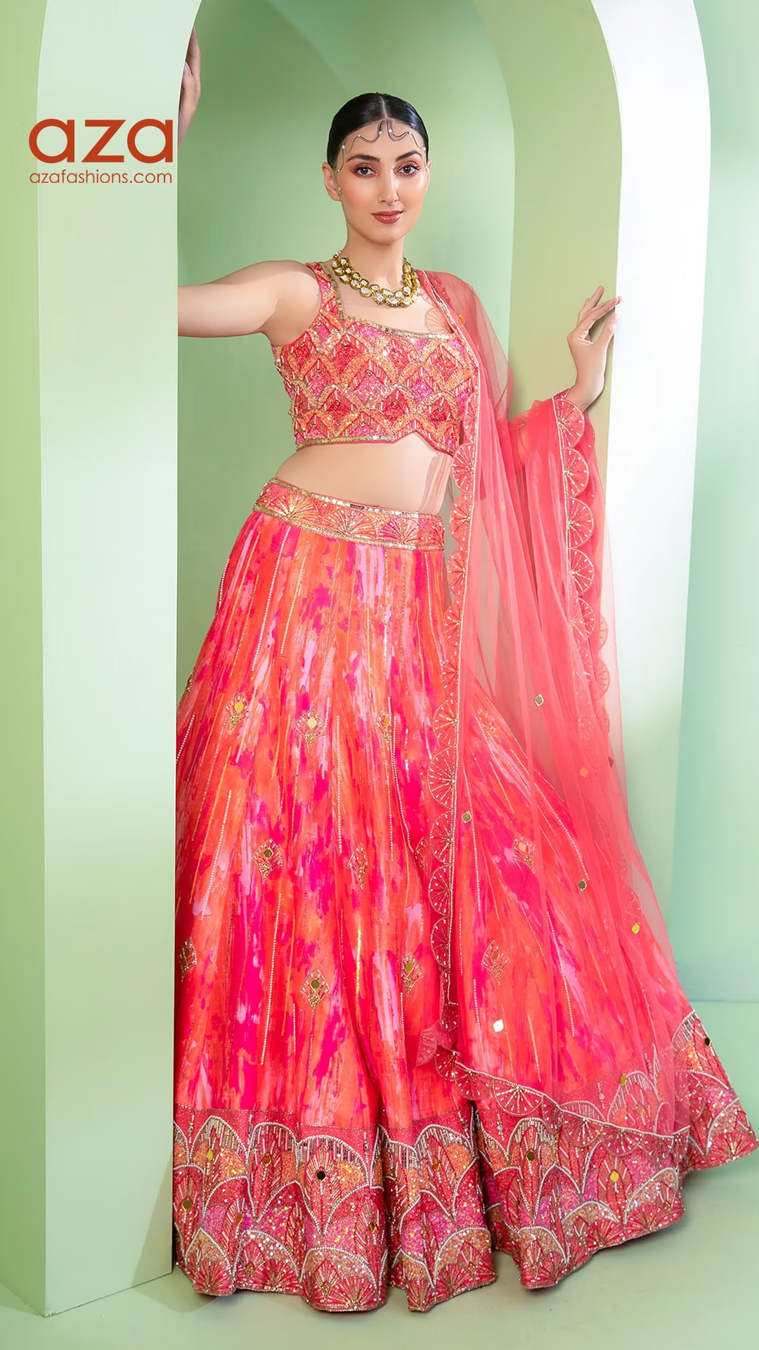 Glow in this radiant floral printed lehenga for the Haldi ceremony.