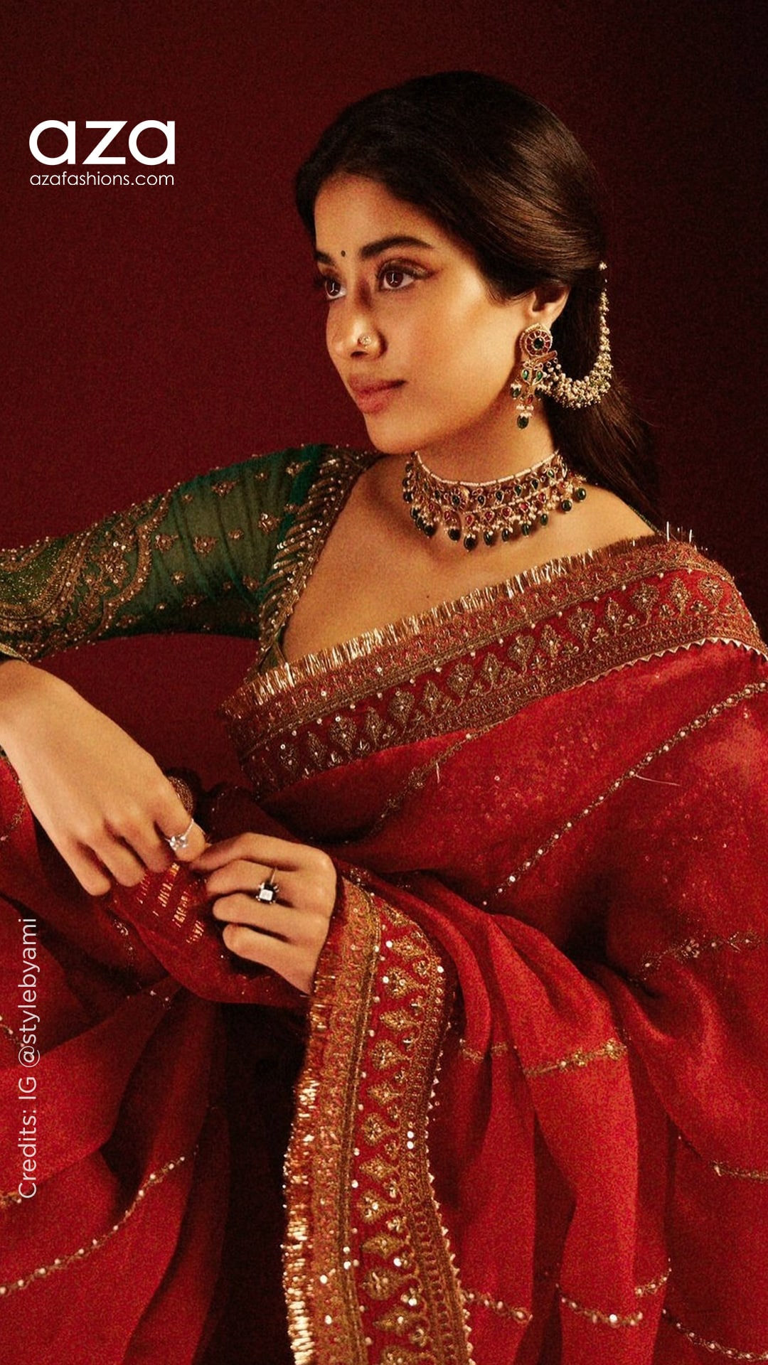 Janhvi Kapoor’s gold Kanjeevaram saree by Manish Malhotra, adorned with delicate silver embellishments, is a regal bridal choice.
