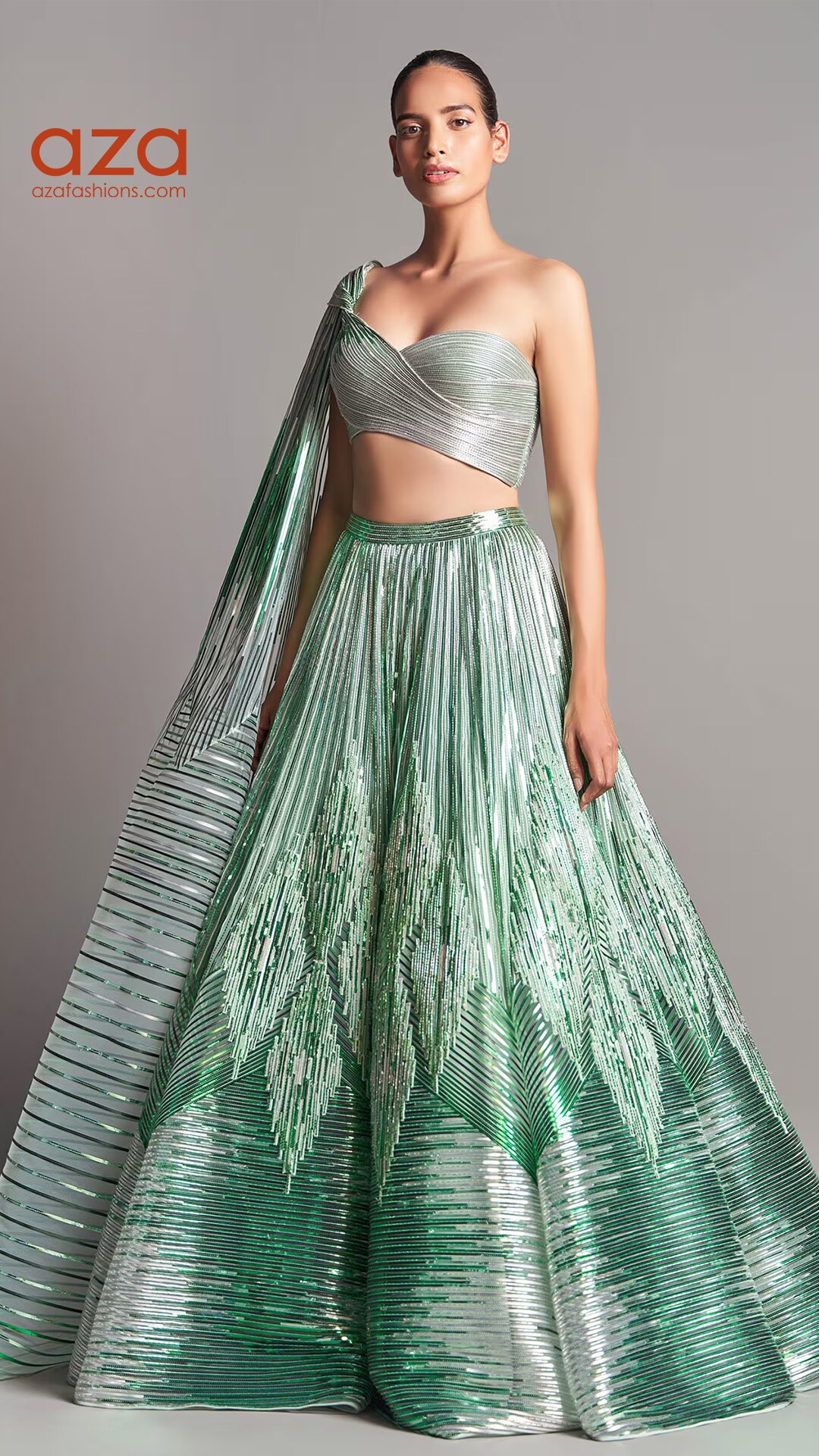 Shimmer in this bronze beauty, a statement metallic lehenga with a zardozi embroidered jacket.
