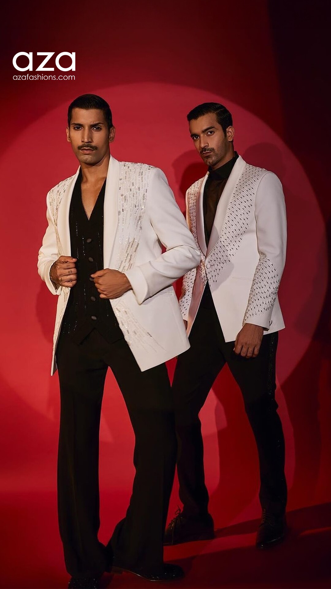 The black rayon tuxedo with bead-embroidered lapels delivers timeless charm for receptions or cocktail parties.
