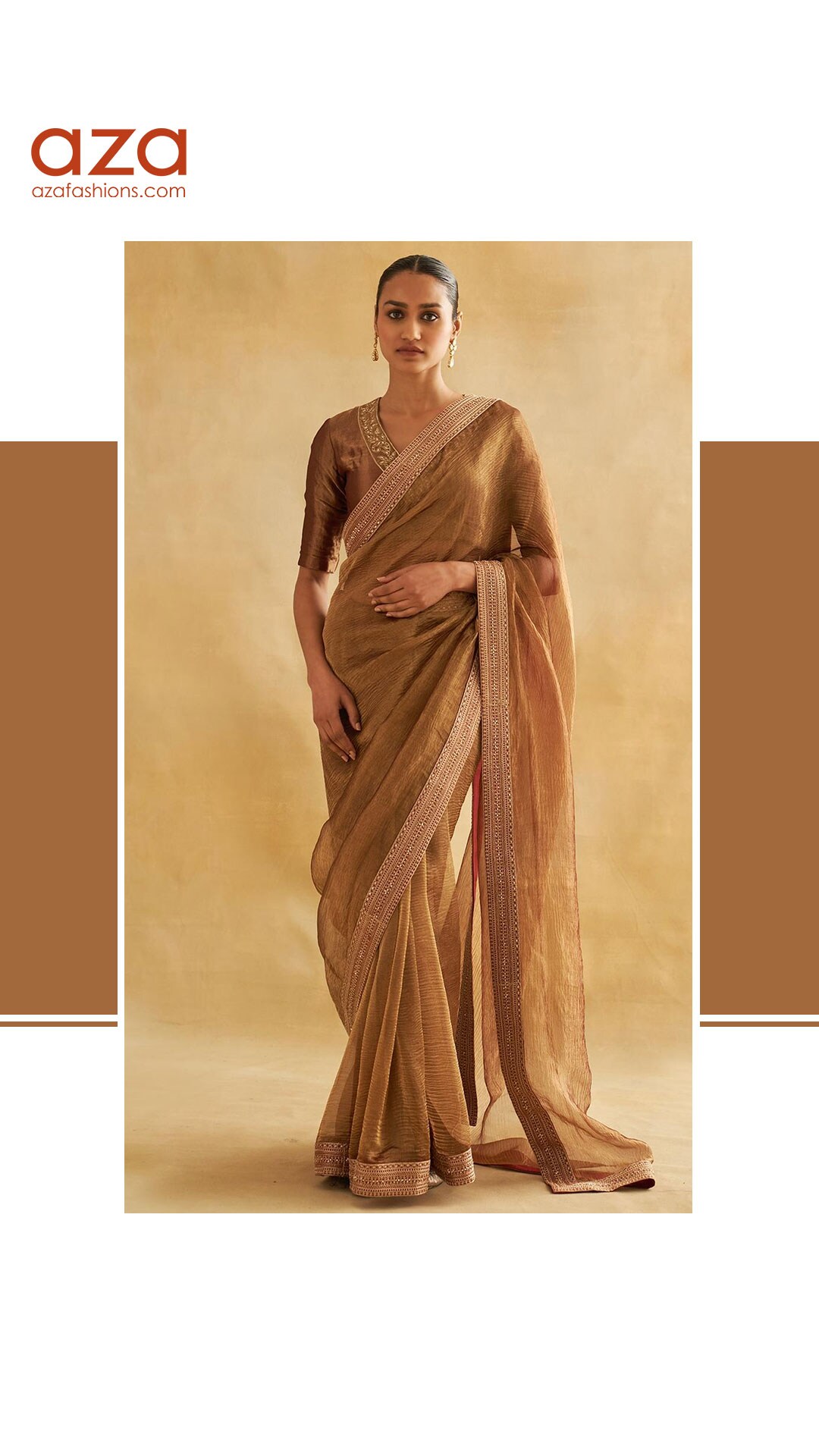 Elegant Drape: Embrace the upcoming festive celebrations with this gold tissue saree.