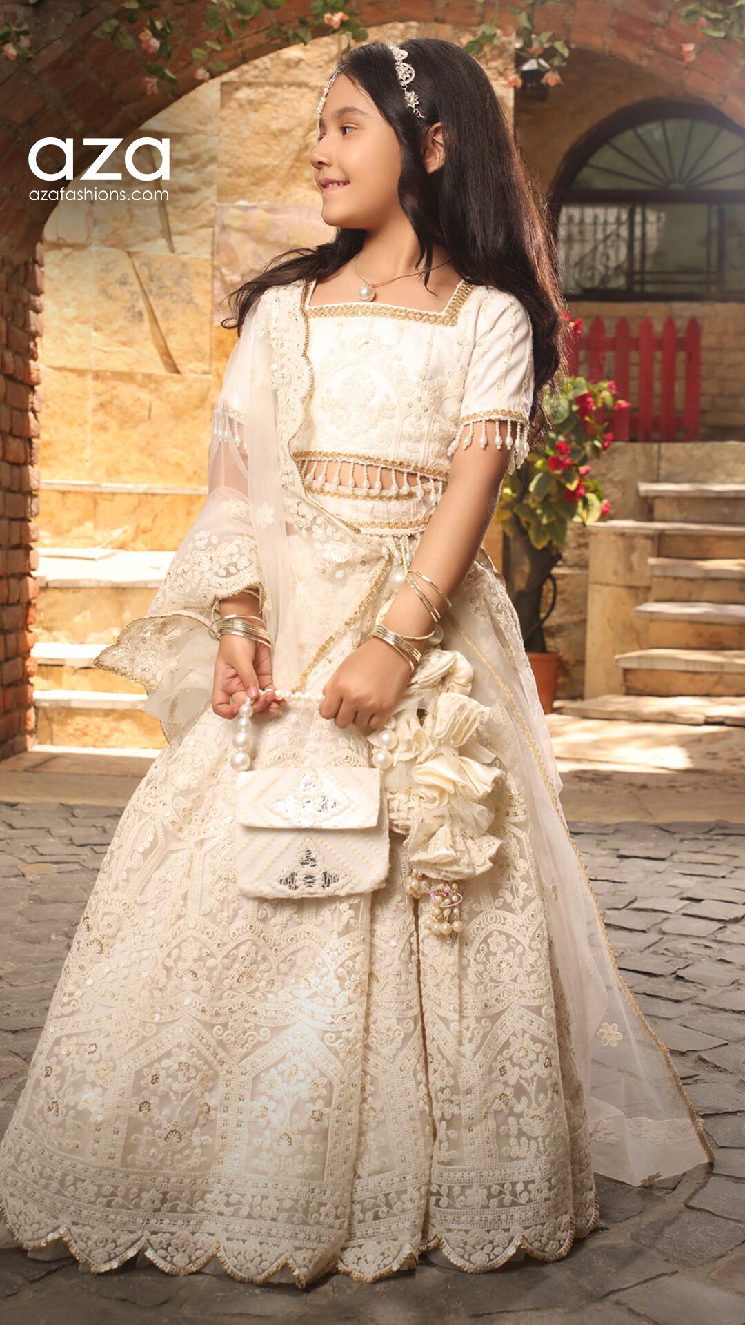 Your kid will love this soft pink designer lehenga that showcases ornate embroidery and is paired with a net dupatta.