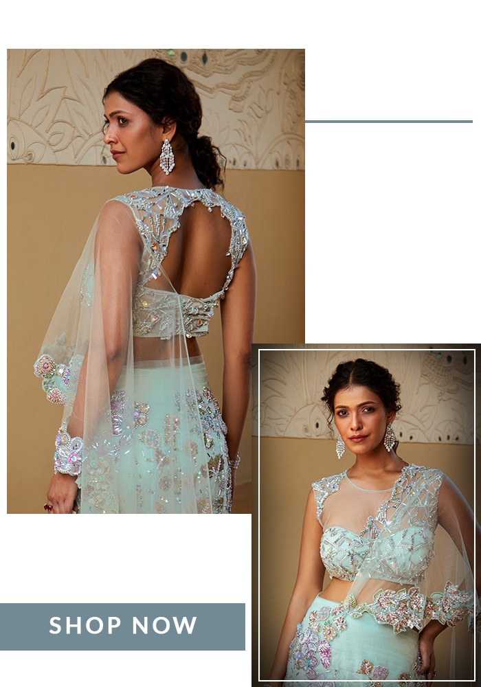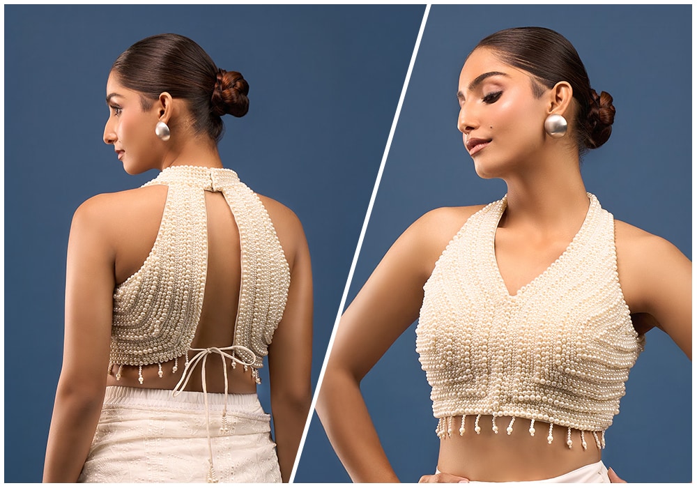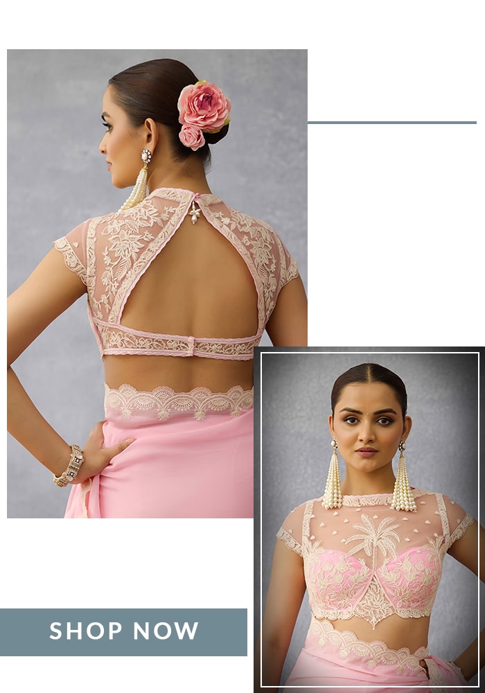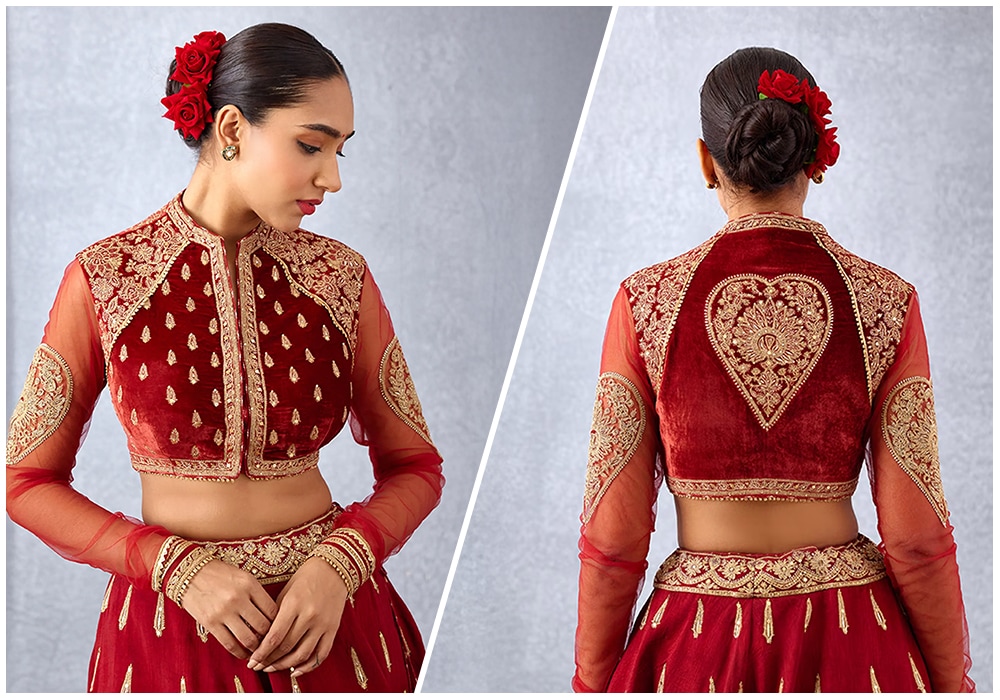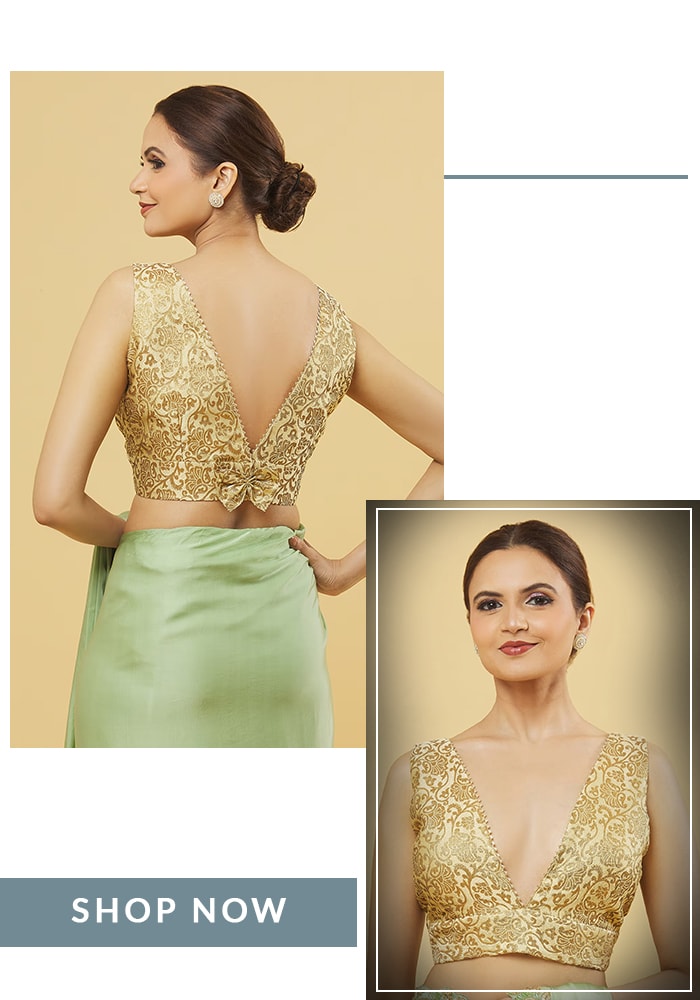 - Simple Saree/Lehenga: If your saree or lehenga is understated, your blouse is where you can make a statement. Go for a heavily embroidered illusion back, a dramatic bow, or an intricate cut-out design to create a high-impact look.