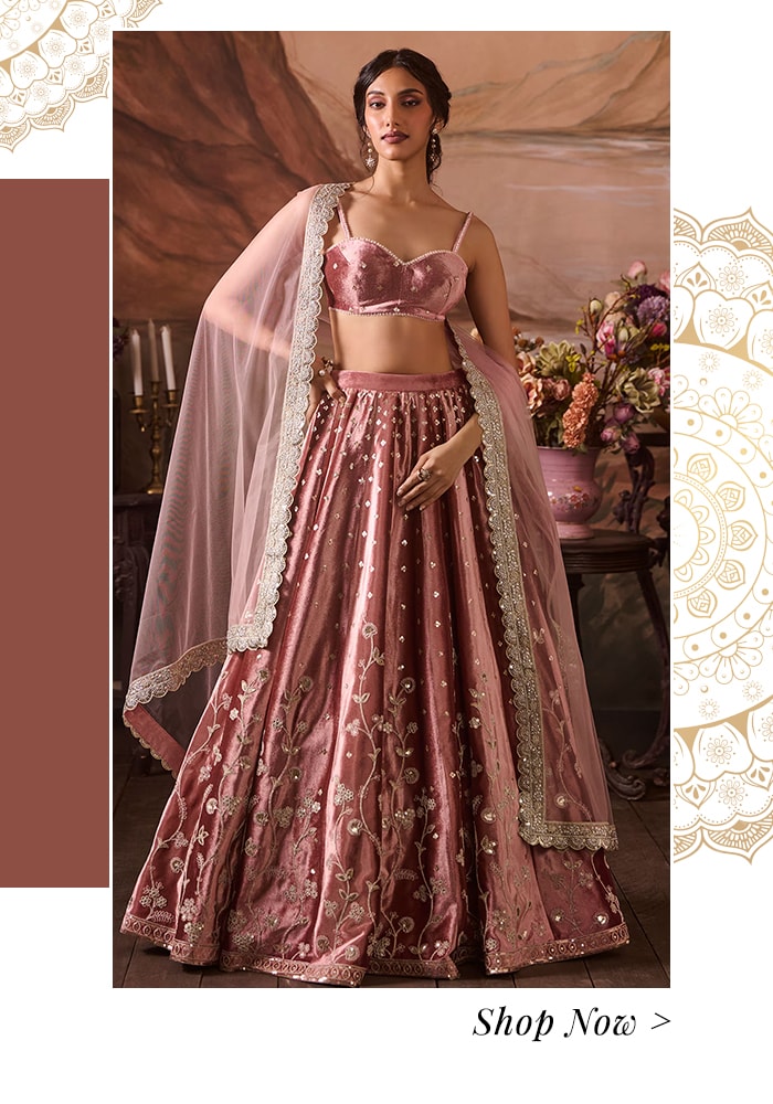 If you are attending a winter wedding or a destination wedding in the mountains, there's no better pick than a designer lehenga in velvet material. It's soft, feminine and perfect for those side hug photos! Want something a little more effortless? A designer saree with hand-embroidered details can bring out the best look for wedding. Tie your hair in a sleek bun with a gajra, a maang tikka and a soft flush of blush, because we are keeping it classic.