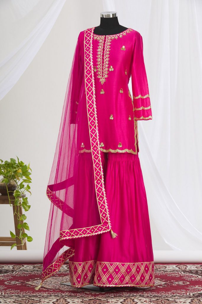 This bright fuchsia sharara set by Neha Khullar ticks all the points in our checklist for a head-turning ethnic outfit. Style it with a maangtikka or a mathapatti for the 'It' wedding look.