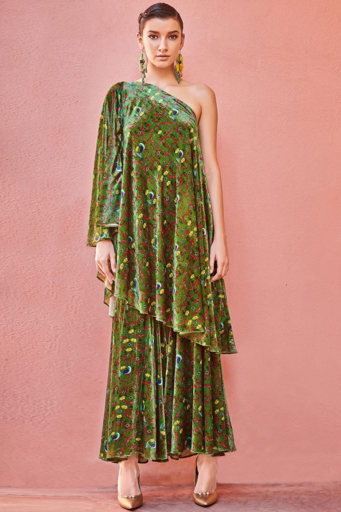 If the theme of the wedding is low-key and contemporary, we suggest resorting to this green off-shoulder number by Nautanky rather than sticking with traditional options.